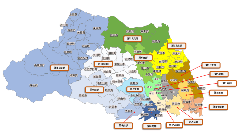 埼玉県には16の支部が存在します。ご自身が住民票を提出している地域が該当支部となります。